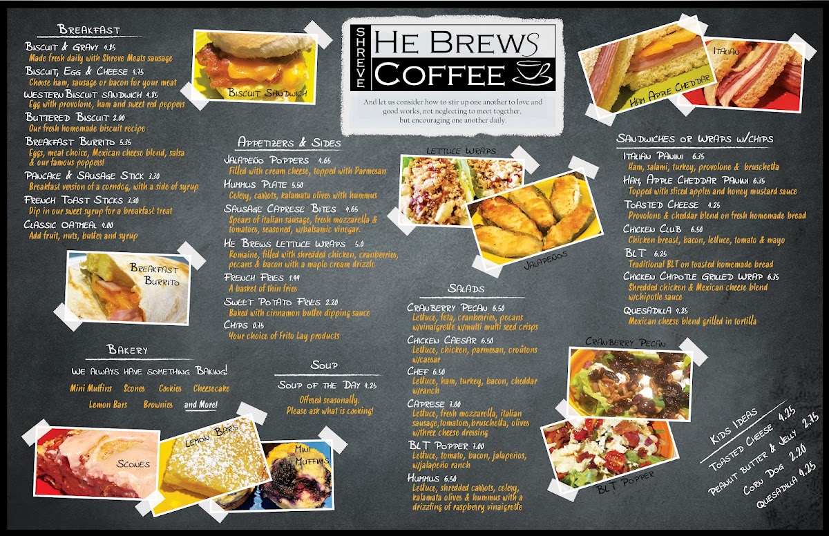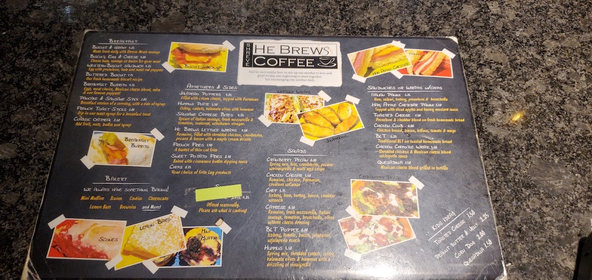 Welcome to HeBrews Coffee, a charming cafe located at 104 S Market St in Shreve, Ohio. This hidden gem offers a cozy, family-friendly atmosphere perfect for coffee lovers and foodies alike. The menu features a delightful range of appetizers such as the unique Jalapeño Poppers and satisfying Sausage Caprese Bites, all priced affordably. For heartier fare, explore their array of sandwiches and wraps, including the Italian Panini and Chicken Chipotle Grilled Wrap, paired with crispy chips.